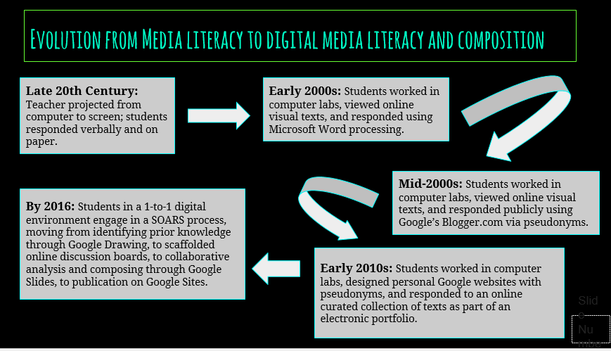 The internet creates many options for gaining information, connecting with others, and sharing ideas. We offer professional development seminars and presentations where participants can learn to analyze social and cultural norms, to compose digitally, and then to share their new expertise with others.